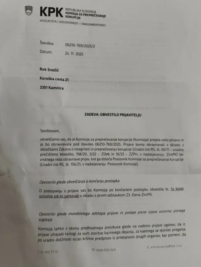KPK je prijavo sprejela v obravnavo. Če bo ugotovljena zloraba položaja ali kakršna koli nepravilnost, bo primer predan policiji in tožilstvu.