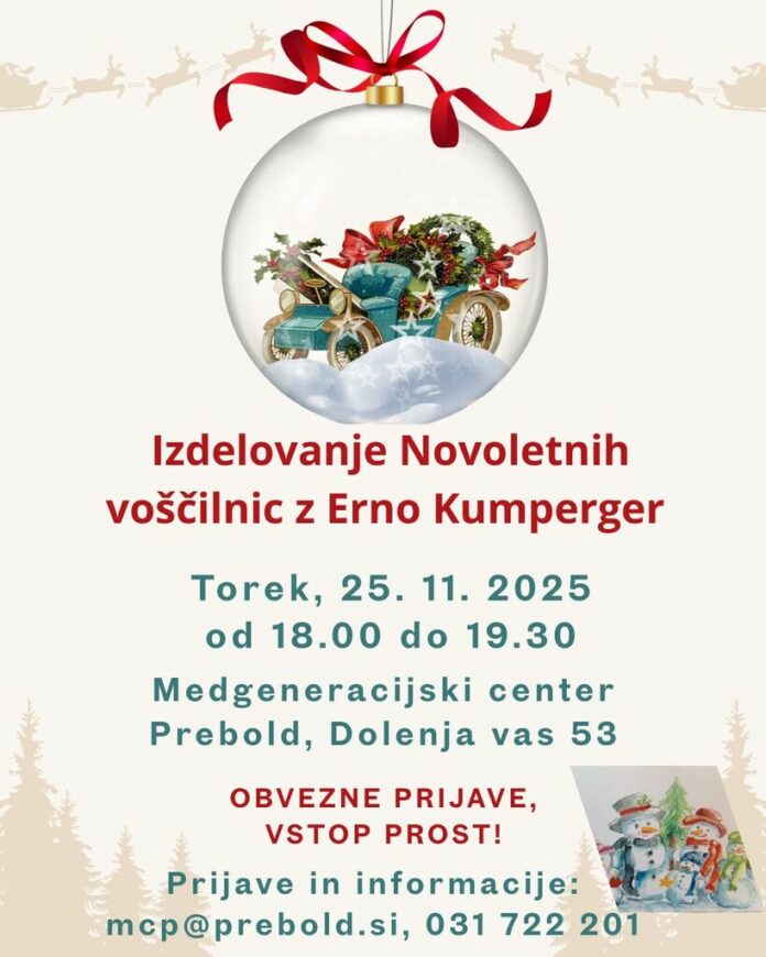 V torek, 25. novembra 2025, od 18.00 do 19.30 vas Medgeneracijski center Prebold vabi na izdelovanje prazničnih voščilnic pod vodstvom Erne Kumperger.